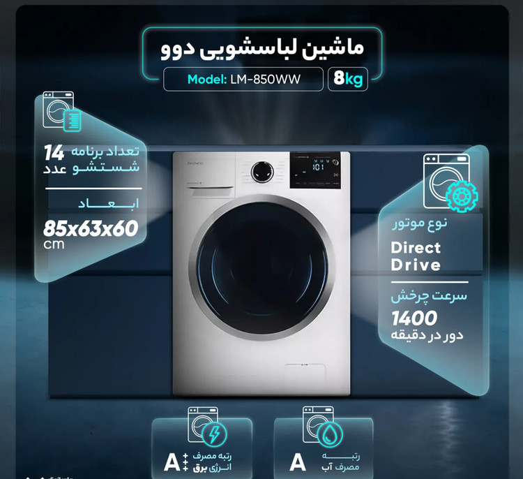 ماشین لباسشویی اتوماتیک دوو مدل LM-850WW ظرفیت۸کیلوگرم