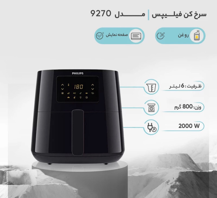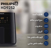 هواپز 6 لیتری فیلیپس مدل 9270، دارای پایه ضد لغزش، دکمه توقف عملیات، قفل ایمنی، تایمر قابل تنظیم، کنترل دیجیتال، دارای بیشتر از 7 حالت حالت پخت شامل پیتزا، ماهی، مرغ، گوشت، سبزیجات، پخت کیک، گرم نگه داشتن، یخ زدایی