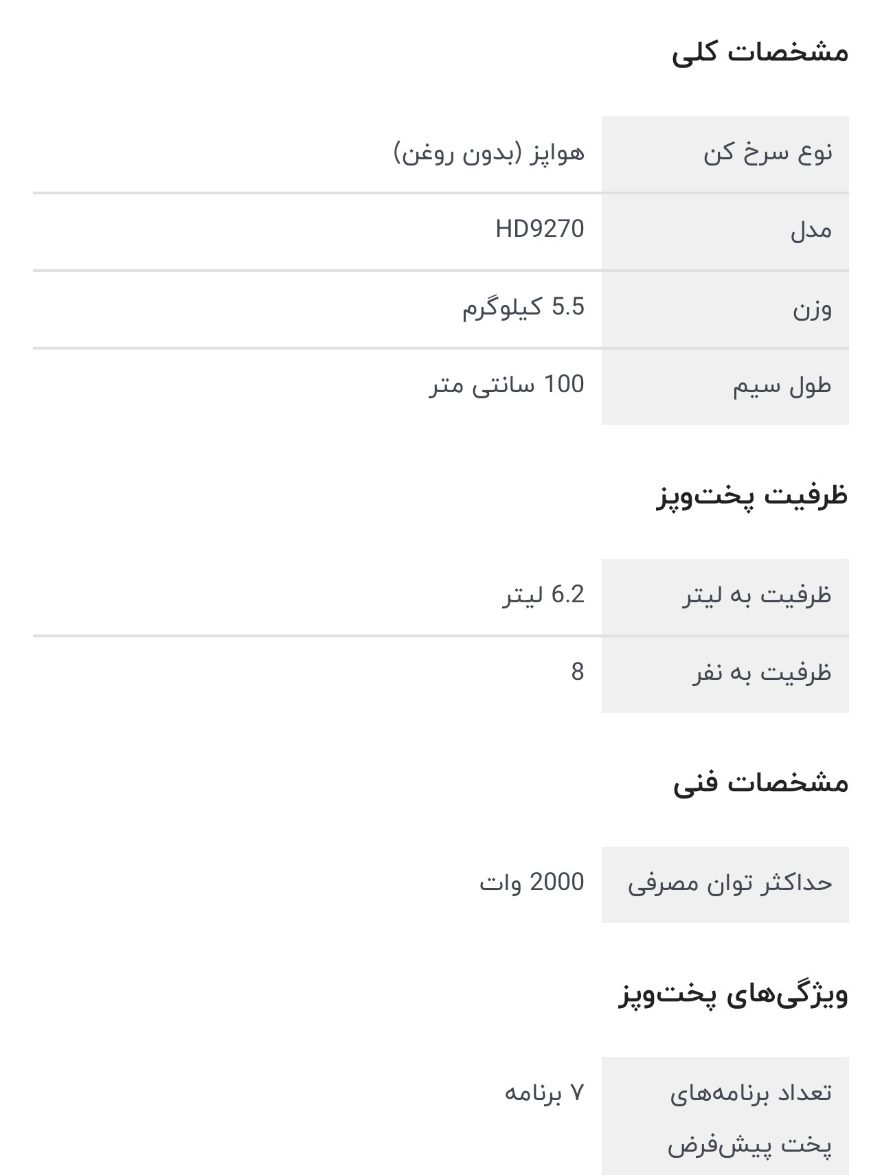 هواپز 6 لیتری فیلیپس مدل 9270، دارای پایه ضد لغزش، دکمه توقف عملیات، قفل ایمنی، تایمر قابل تنظیم، کنترل دیجیتال، دارای بیشتر از 7 حالت حالت پخت شامل پیتزا، ماهی، مرغ، گوشت، سبزیجات، پخت کیک، گرم نگه داشتن، یخ زدایی