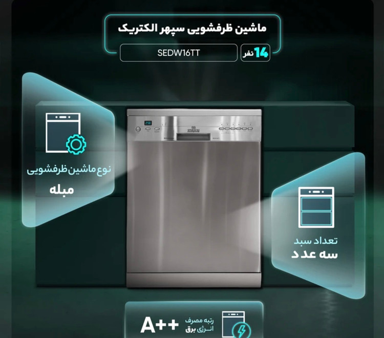 ماشین ظرفشویی 14 نفره سپهر الکتریک مدل SEDW16TT اینورتر سه سبد رنگ تیتانیومی و رنگ سفید