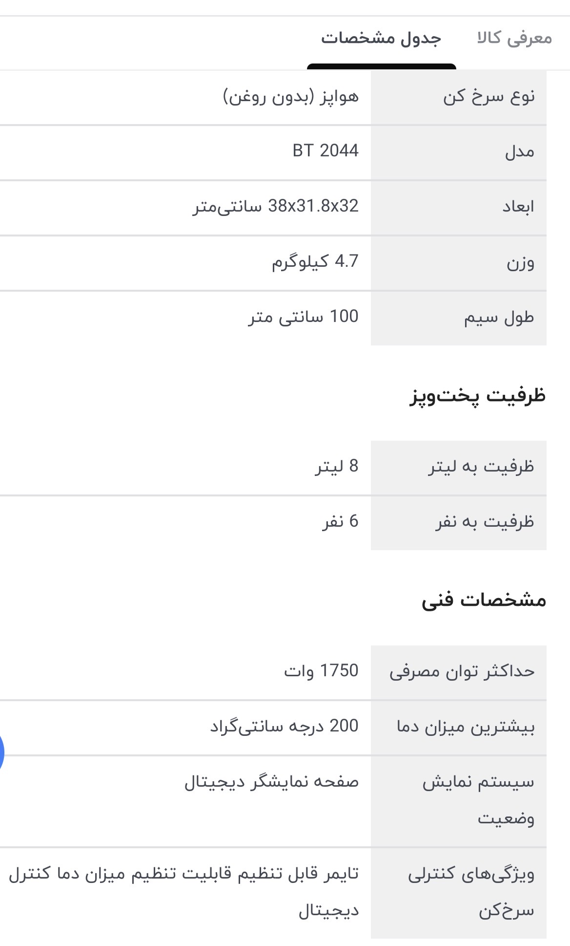 سرخ کن،هواپز 8 لیتری کن مدل 2044BT، دارای پوشش نچسب، سیستم قطع خودکار، تایمر قابل تنظیم، کنترل دیجیتال و قابلیت تنظیم میزان دما، دارای بیشتر از 7 حالت پخت شامل پیتزا، ماهی، مرغ، گوشت، سبزیجات، سیبزمینی، گریل